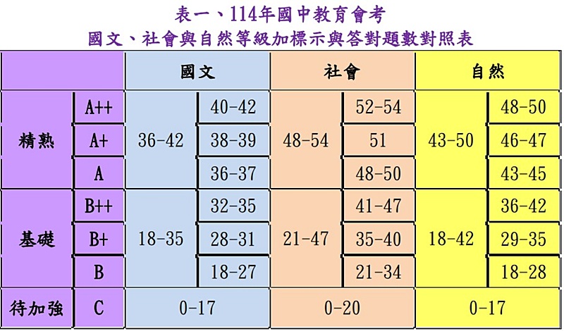 114會考各科能力等級加標示與答對題數對照表