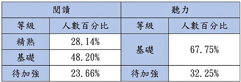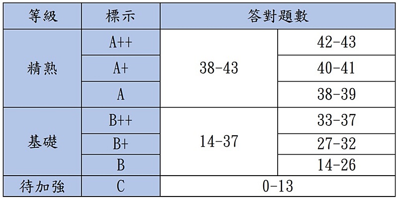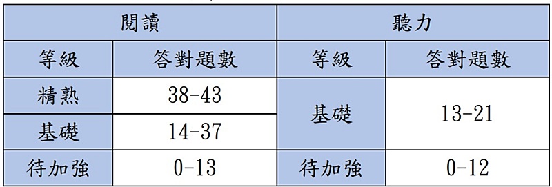 備註:免參加英語(聽力)考試之考生英語(閱讀)等級即為英語整體等級,並依其英語(閱讀)答對題數加註標示。
