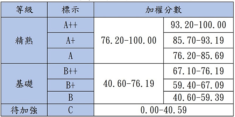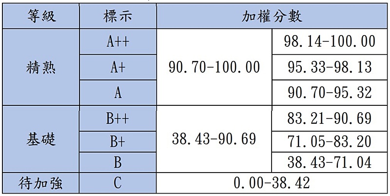 114年國中教育會考英語整體等級加標示與加權分數對照表