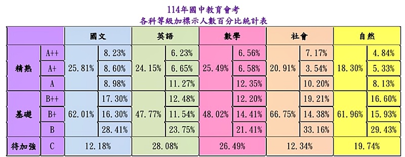 114會考各科等級加標示人數百分比統計表