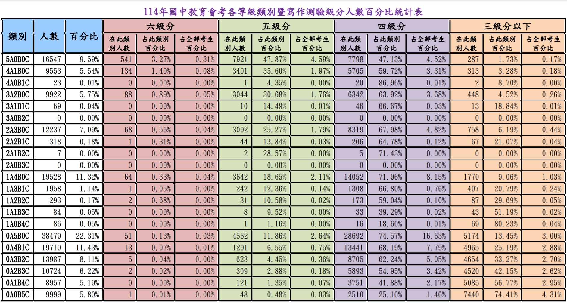 114年會考各等級類別暨寫作測驗級分人數百分比統計表