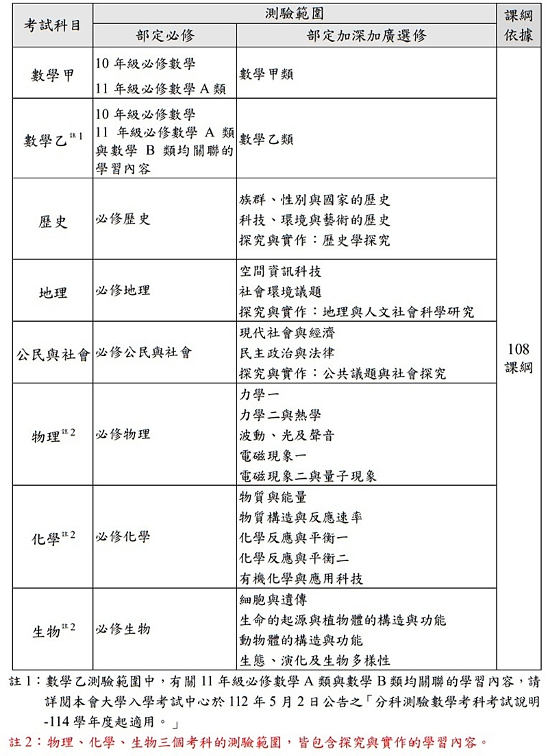 依據十二年國民基本教育國民中小學暨普通型高級中等學校各領域課程綱要,各考科測驗範圍如下表: