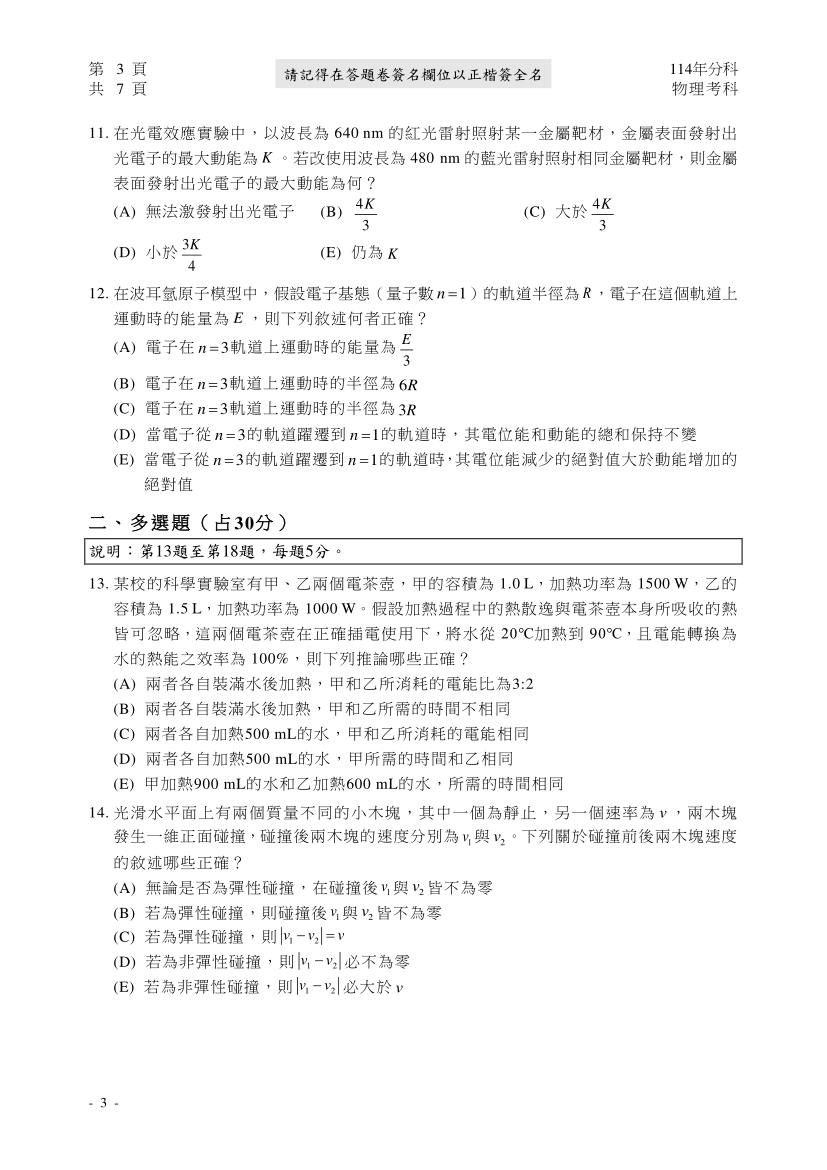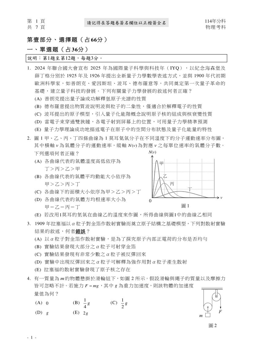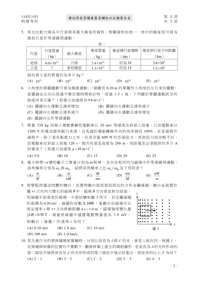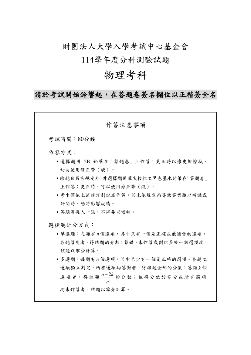 114分科測驗物理科完整試題及解答