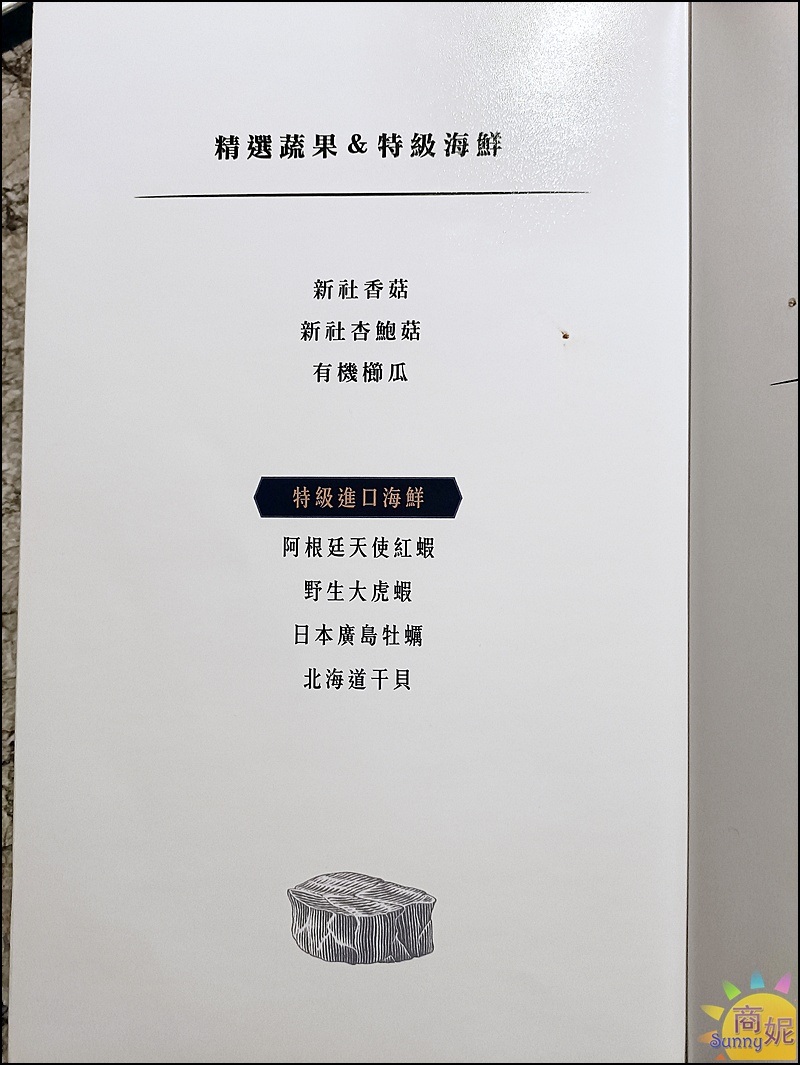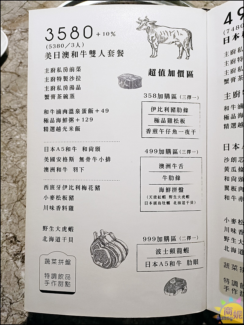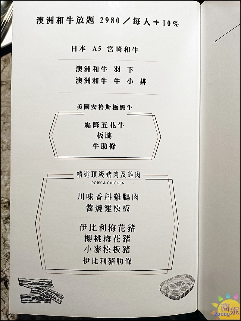 2980元可以點的內容就相當多,澳洲M9+和牛、美國安格斯黑牛、頂級豬肉、天使紅蝦、大虎蝦、北海道大干貝、廣島牡蠣、還有主廚私房料理、各種日本啤酒飲料、甜點湯品…..通通無限續點。