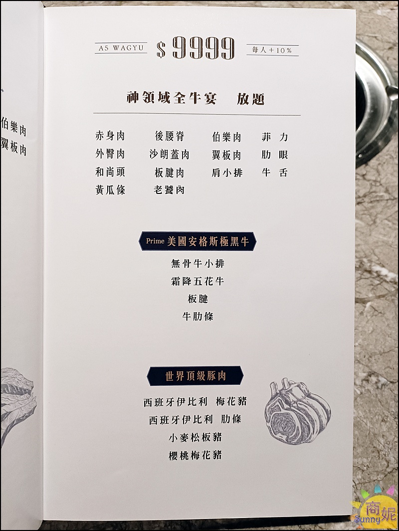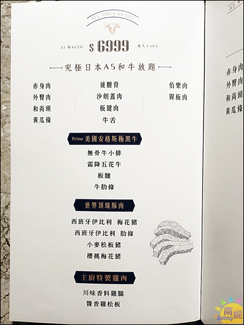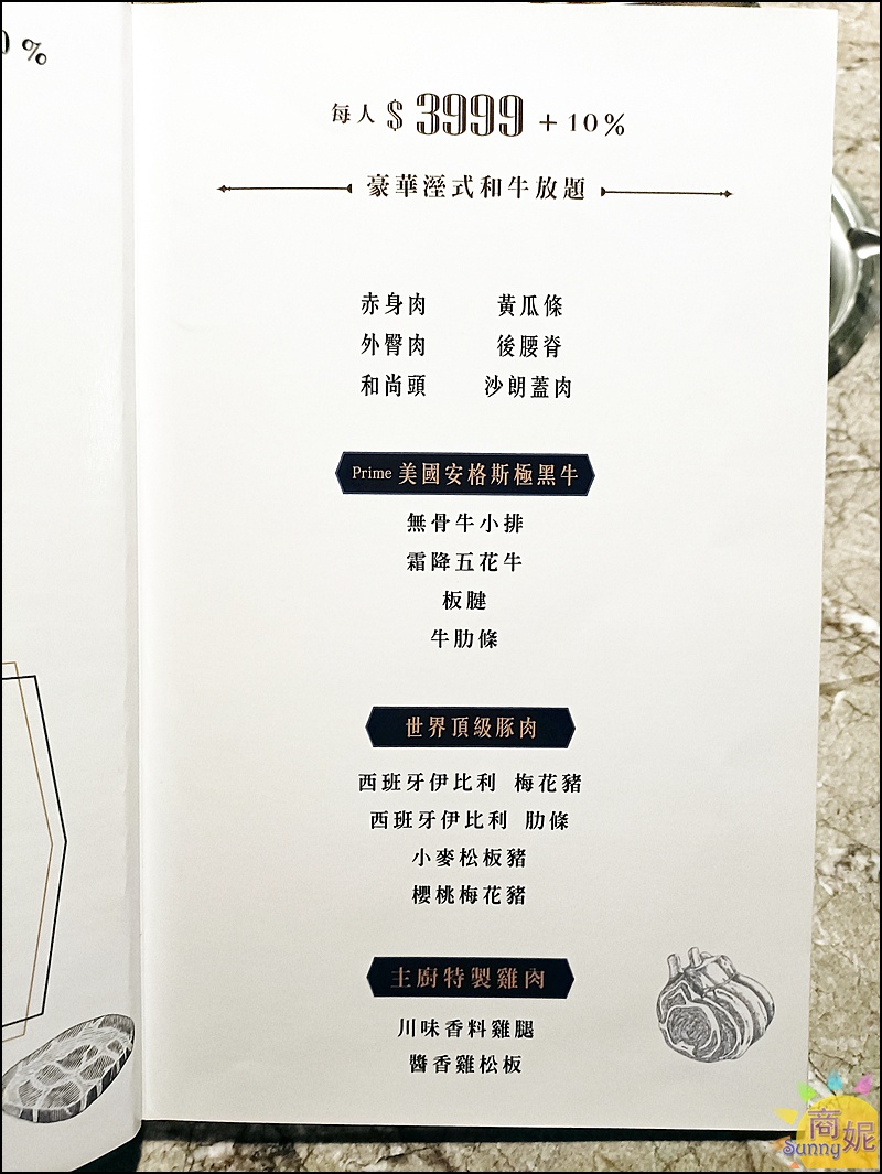 看完菜單已經瞠目結舌,以前想要吃日本和牛都要買機票,現在在台中可以吃到爽,不只A5和牛無限放題,美國安格斯黑牛、頂級豚肉、高檔海鮮、法式前菜、各種日本啤酒飲料、冰淇淋、甜點…通通吃個過癮。