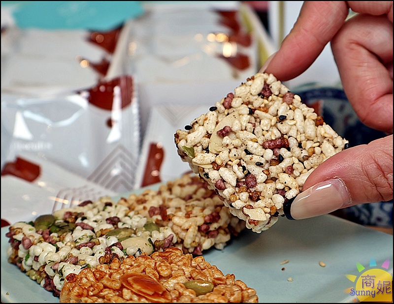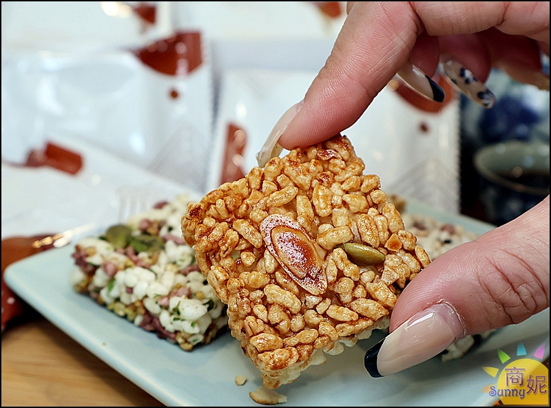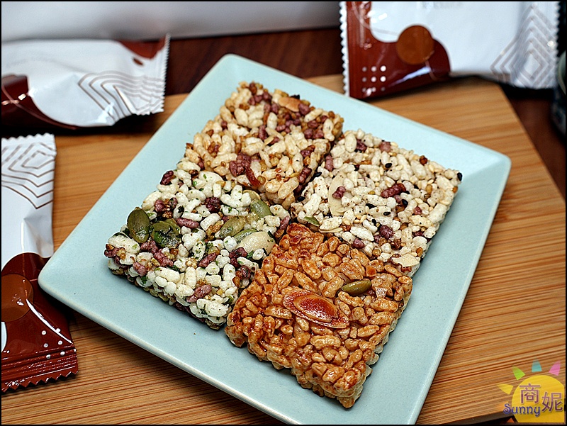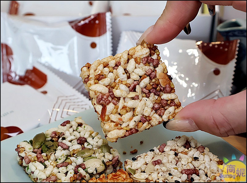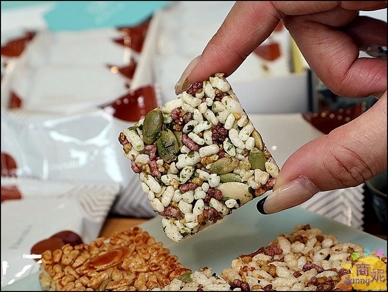 方形米果用霧峰71號香米再加上芝麻、紫米、南瓜子、蕎麥、杏仁片混合,比傳統爆米香更有層次感,而且是無麩質點心更健康。