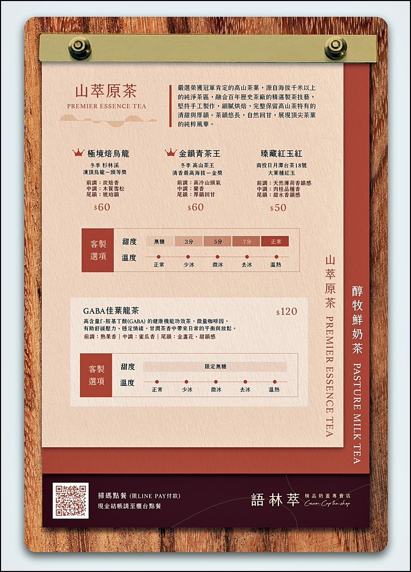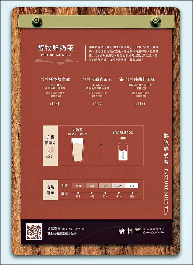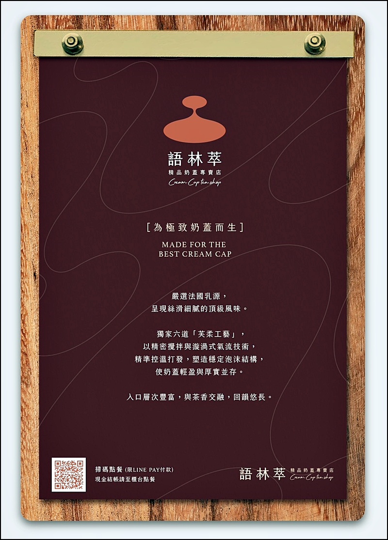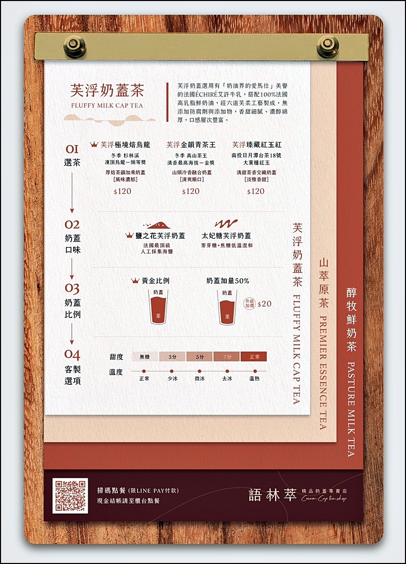 語林萃菜單上共分芙浮奶蓋茶、山翠原茶、醇牧鮮奶茶三個系列。價位50~120元,可客製化選擇甜度、溫度。其中最多人點也是店內招牌,就是芙浮奶蓋茶系列,由3款頂級台灣茶搭配鹹/甜兩種奶蓋,獨特的美味喝過就愛上。