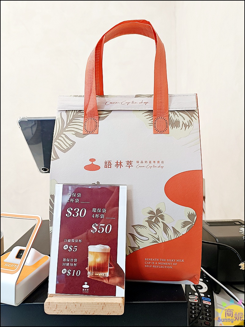 結帳台前有展示環保袋,2杯袋30元/4杯袋50元。