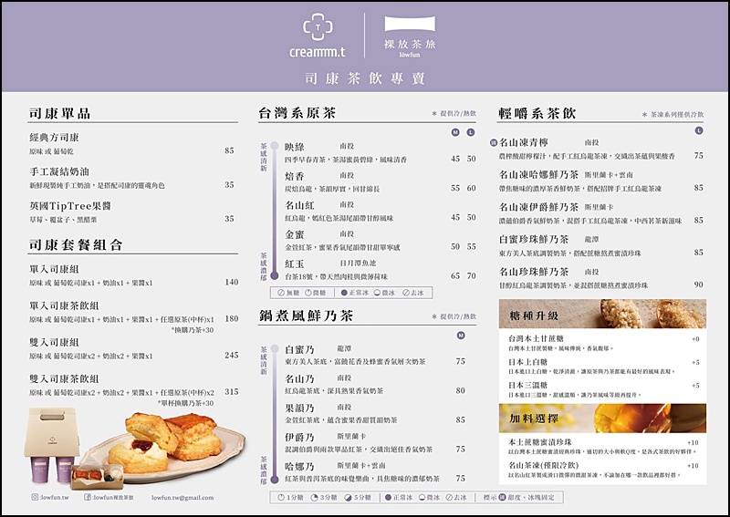creammm.t 與茶飲品牌「löwfun裸放茶旅」聯手打造的茶飲司康專賣店,主打「少一點更快樂」的減法生活哲學。裸放茶旅以原茶(裸味)與奶茶(乃味)為主軸,並提供糖類自選服務,包括台灣甘蔗糖、日本三溫糖、沖繩本和香糖等,讓每一杯茶都能客製化風味。