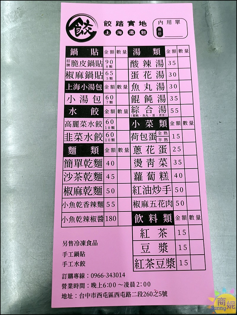 餐點以鍋貼湯包為主,還有麵食與湯品、豆漿紅茶。價位不貴也不算便宜,可以接受。內用是粉紅色菜單,外帶則是黃色菜單,選好餐點要到工作區那邊先買單。