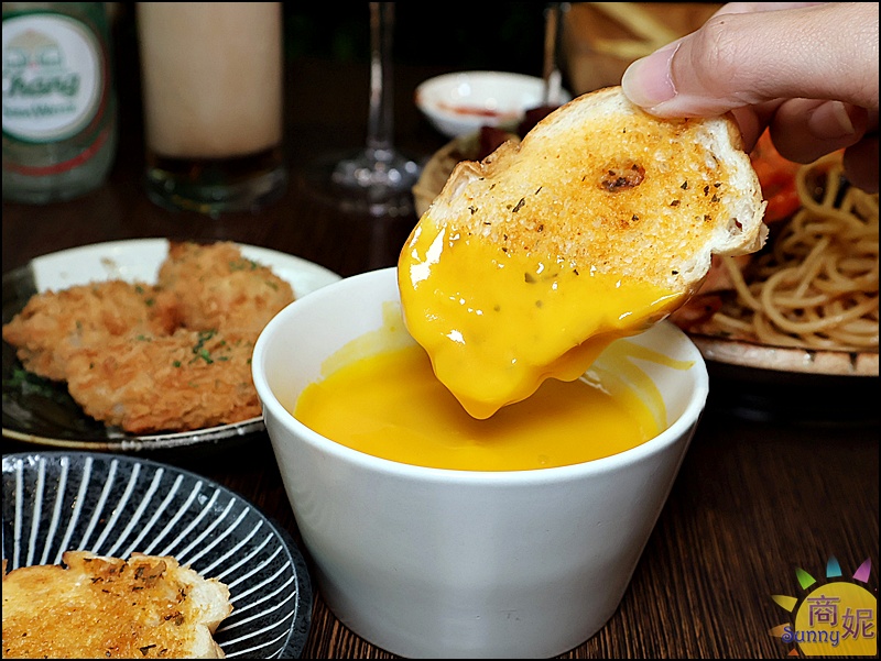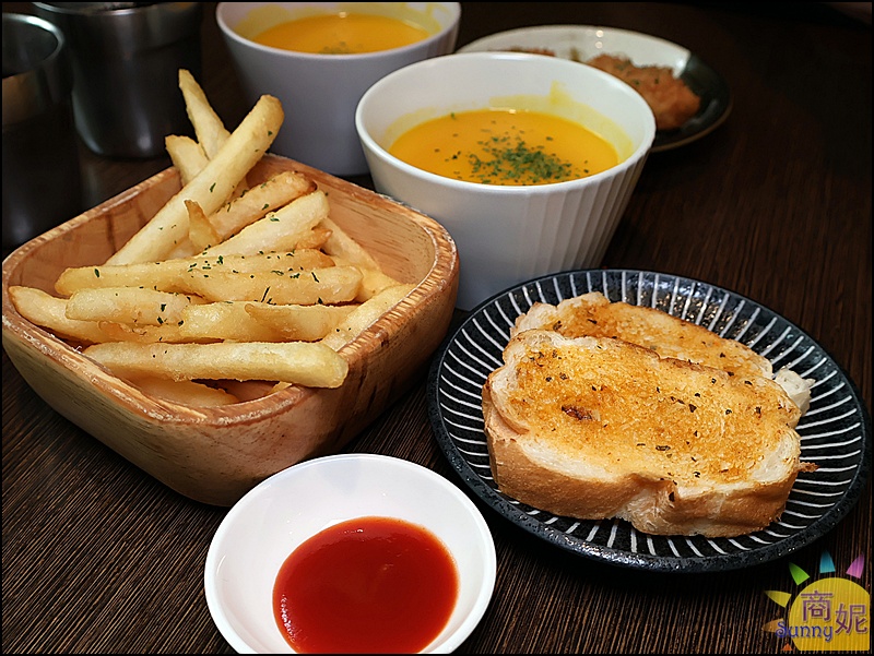 南瓜濃湯味道濃郁,脆皮法國麵包現烤上桌,趁熱吃酥脆好吃,搭配濃湯也不錯。