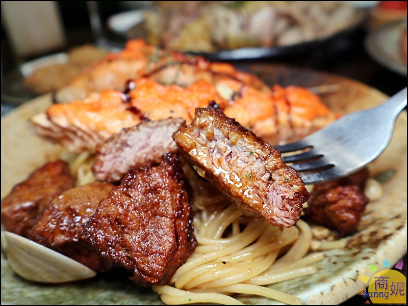 有先醃過相當入味,肉汁原本就甜,搭配蛤蜊及鮭魚,海陸雙重享受真是過癮。