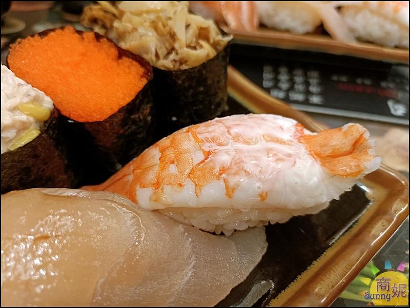 這個蝦握壽司跟迴轉壽司的品質差不多,不過底下的醋飯比迴轉壽司份量多很多,感覺比較優。