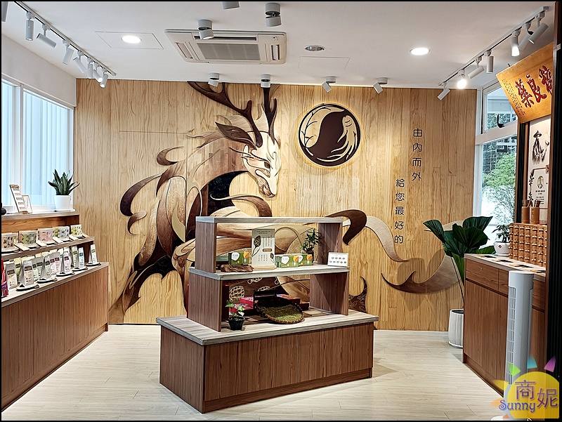 有益帖位在本棟2樓,得過神農獎的有益帖主打草本日常的全方位守護,一進門就看到一大片實木雕刻牆面,神農氏騎乘的祥瑞神獸~麒麟,代表自然純粹,呼應有益帖的草本精神。
