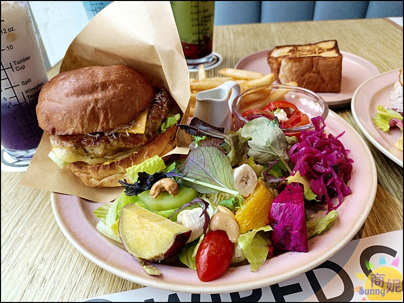 主食起司漢堡之外,旁邊還有大量蔬果沙拉、炸薯條、開胃點心,擺盤漂亮光是看就讓人喜歡。