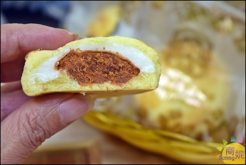切開來看,內餡是台灣本地豬肉製作的肉鬆,肉鬆好飽滿很紮實,看比例大約半顆Q餅的份量,用料真的不手軟啊。