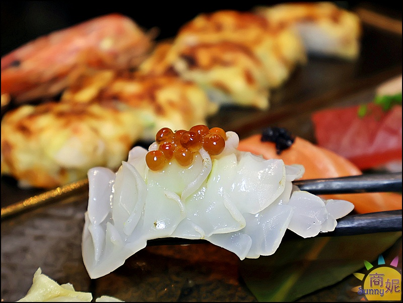 新鮮軟絲又嫩又Q,刻花後加上鮭魚卵整個口感超棒!!