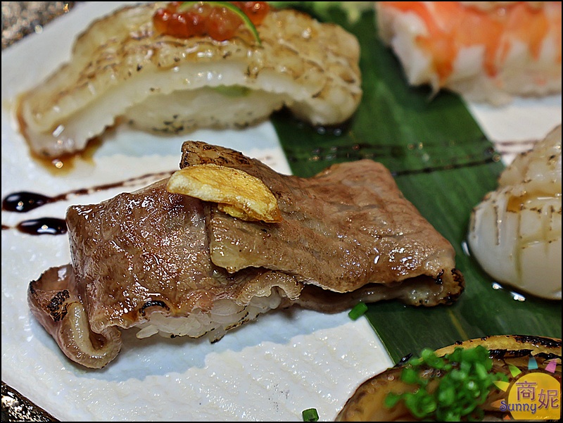 還有安格斯牛小排握壽司也是很正點,牛小排炙燒後逼出油脂香氣與甜味,口感軟嫩味道特別甜,加上蒜片提味更好吃。