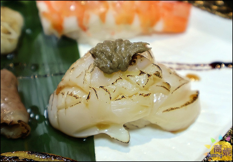 干貝蟹膏握壽司 生食級大干貝本身就很軟嫩,加上鮮甜的蟹膏醬甜上加甜,太享受了啦~
