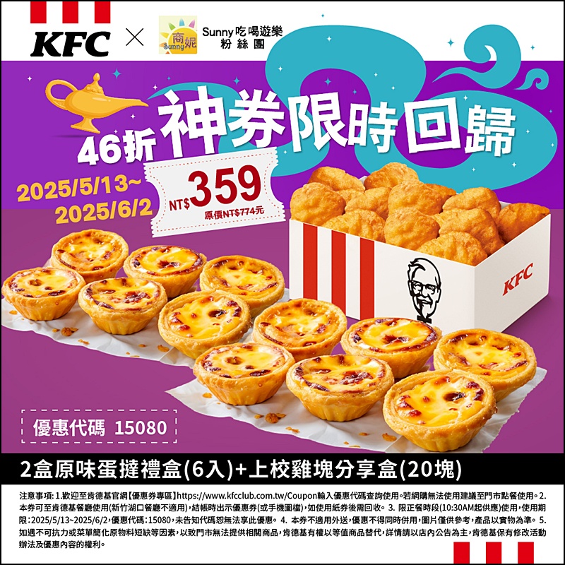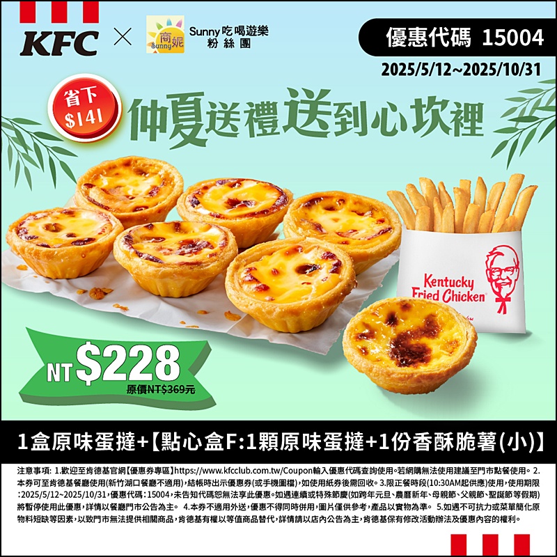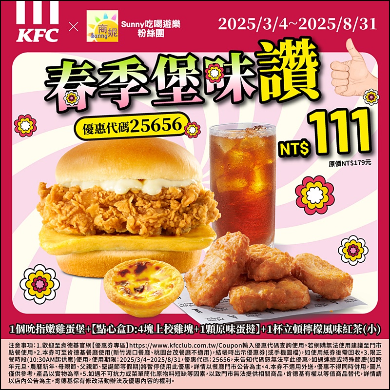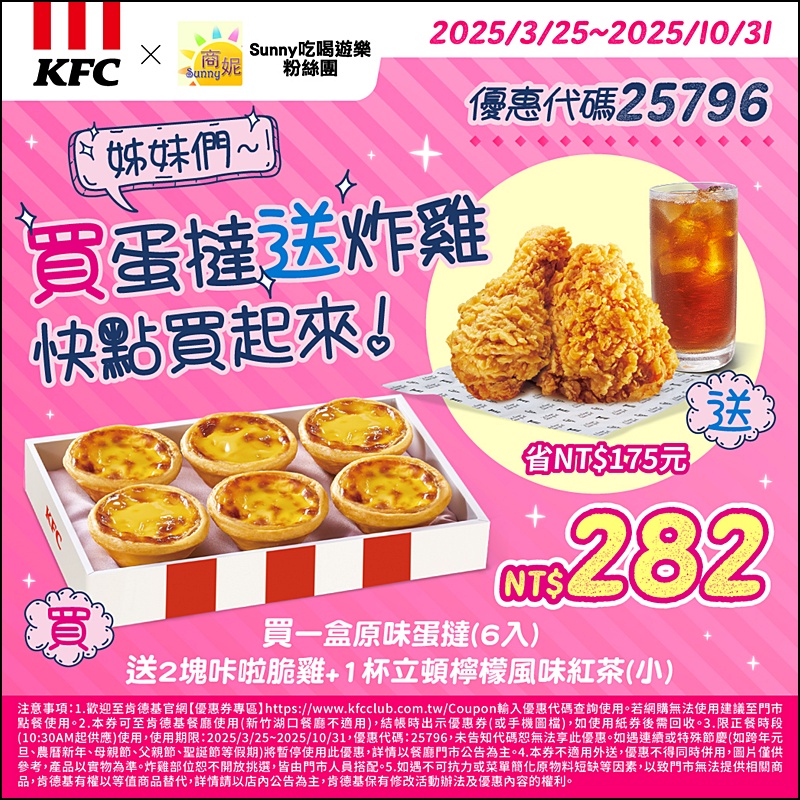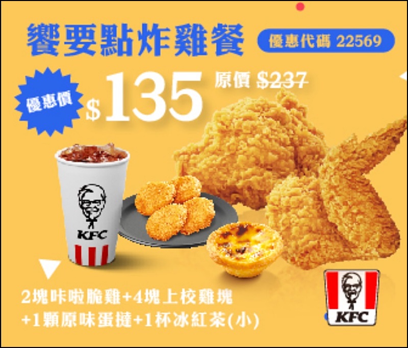 優惠內容:4塊上校雞塊+1顆原味蛋撻+1杯立頓檸檬風味紅茶(小)=優惠價80元(原價129元)