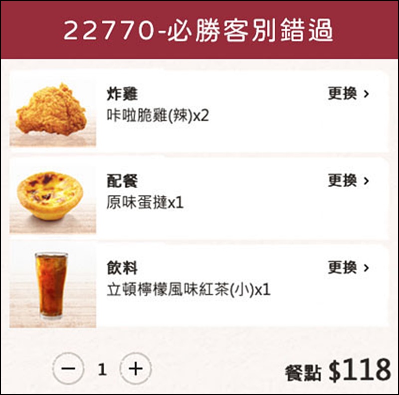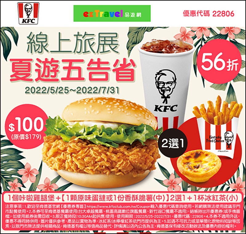 優惠內容:1個咔啦雞腿堡+1份香酥脆薯(小)+1杯冰無糖綠茶(小)=優惠價111元(原價168元)