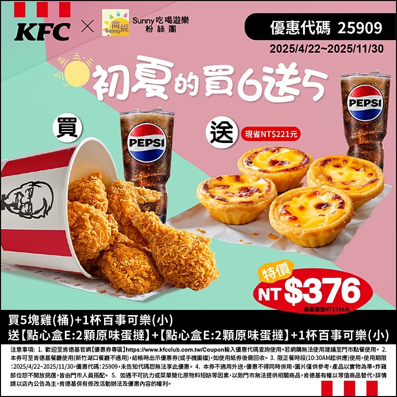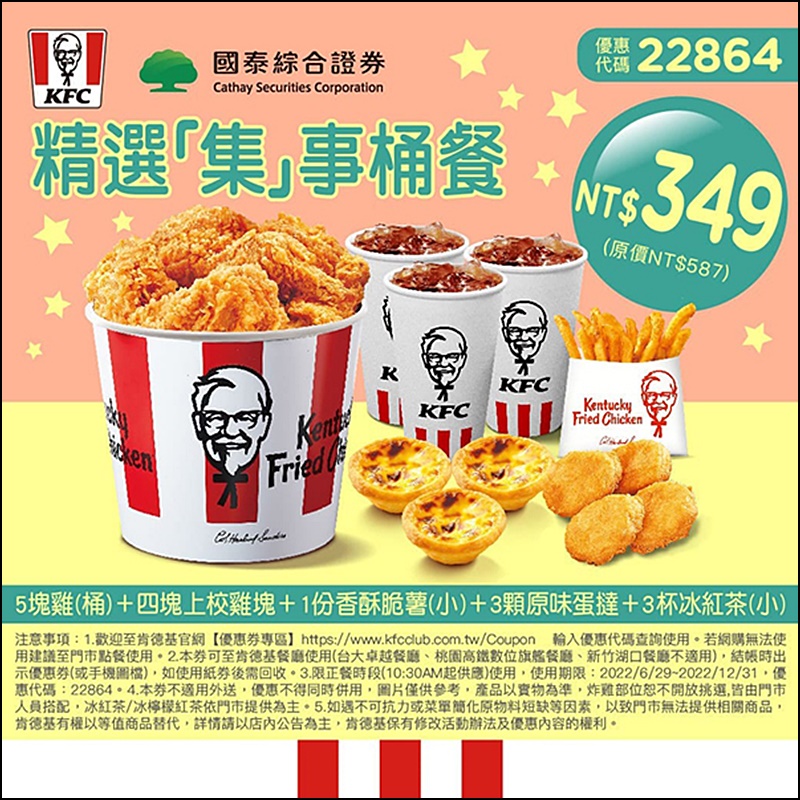 優惠內容:5塊雞(桶)+【點心盒E:2顆原味蛋撻】+【群星盒G:4塊上校雞塊+1顆原味蛋撻+10顆雙色轉轉QQ球】+1杯冰無糖綠茶(小)=NT$393元(原價NT$637元)