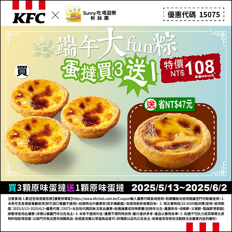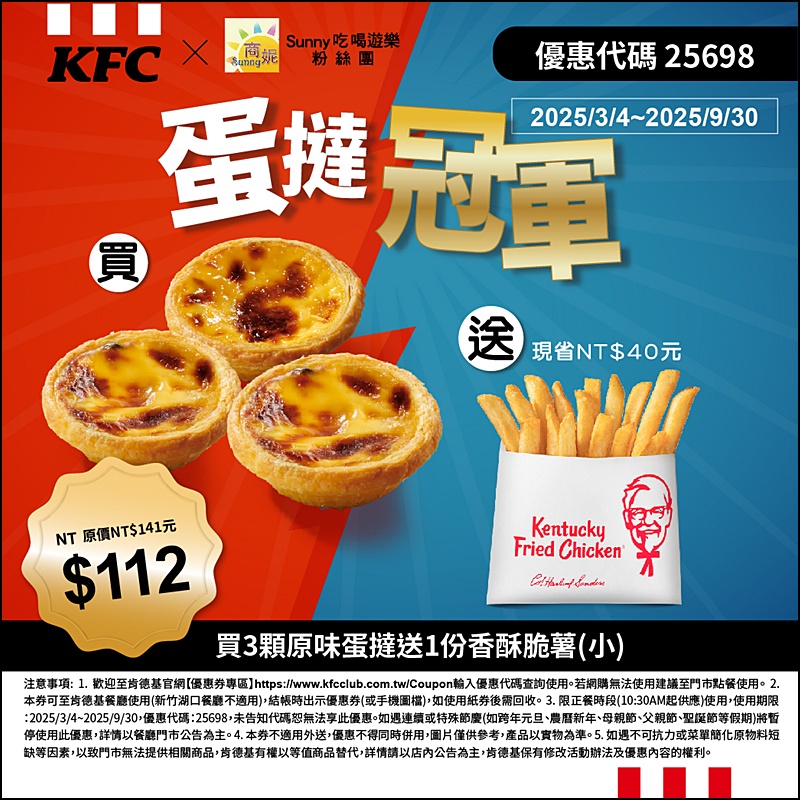 優惠內容:1塊咔啦脆雞+1顆蛋撻+1杯無糖綠茶(小)=優惠價94元(原價151元)