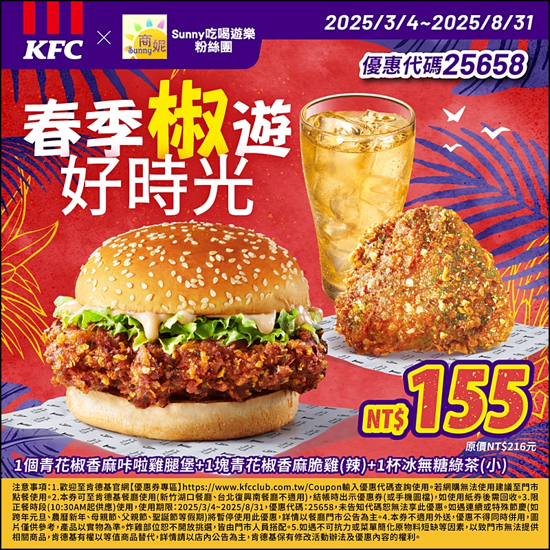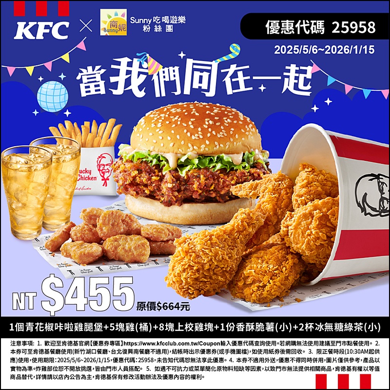 優惠內容:5塊雞(桶)+2個青花椒香麻脆雞(辣)+8個上校雞塊+2杯冰無糖綠茶(小)=優惠價449元(原價675元)
