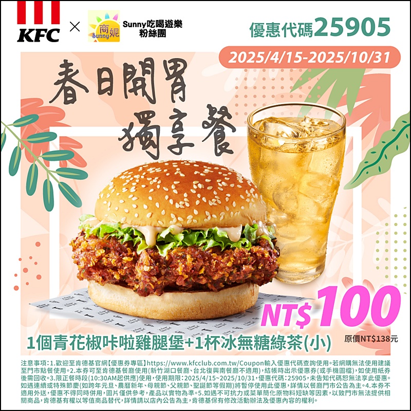 優惠內容:1個雙層咔啦雞腿堡+1杯冰無糖綠茶(小)=優惠價145元