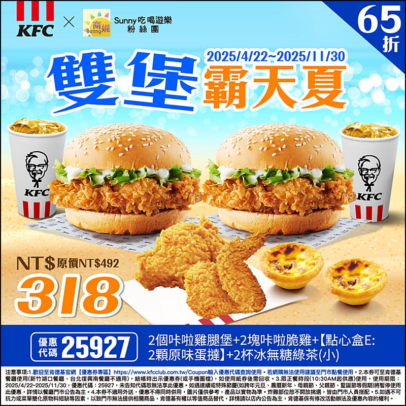 優惠內容:1個花生熔岩咔啦雞腿堡+2顆原味蛋撻=優惠價159元(原價221元)
