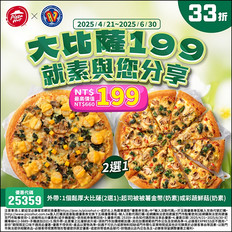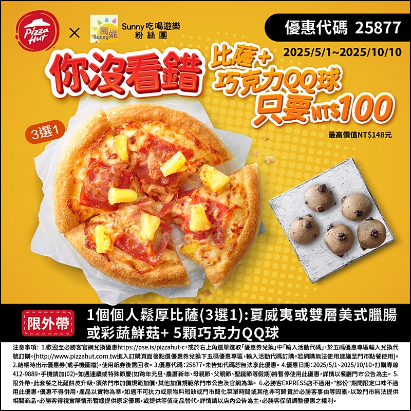 B區:1個六吋個人鬆厚比薩(口味3選1:夏威夷或日式照燒雞或彩蔬鮮菇)