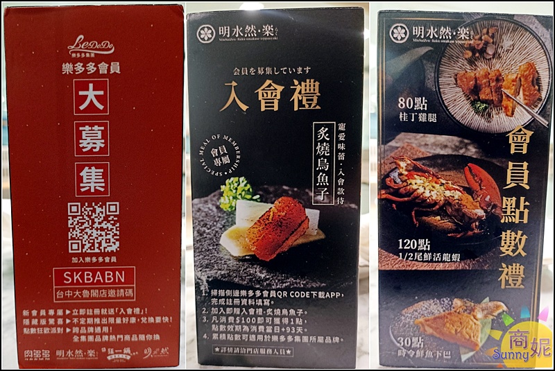 明水然樂優惠不少,桌上立牌就看到有入會禮、會員點數禮。