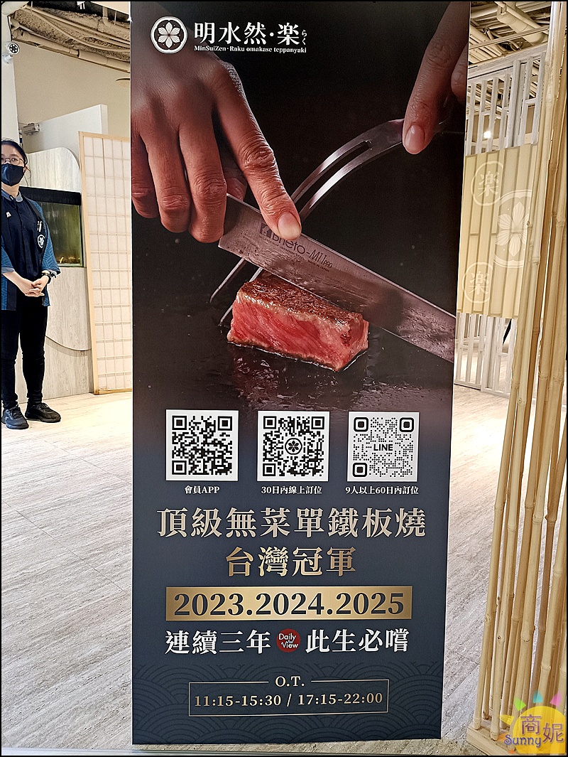 明水然樂無菜單鐵板燒採預約制,僅提供一個月內場次預訂,假日更是一位難求,建議一定要提早訂位: https://booking.twledodo.com/