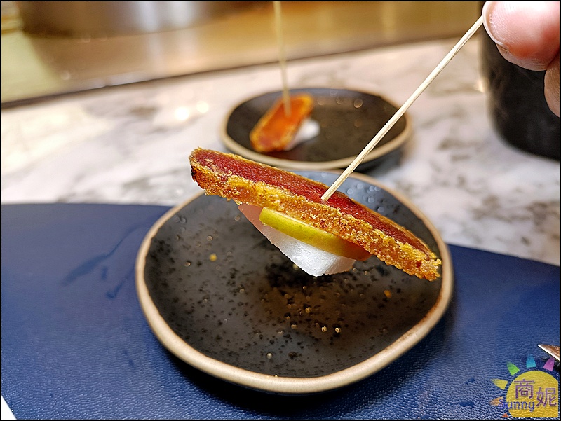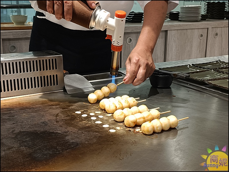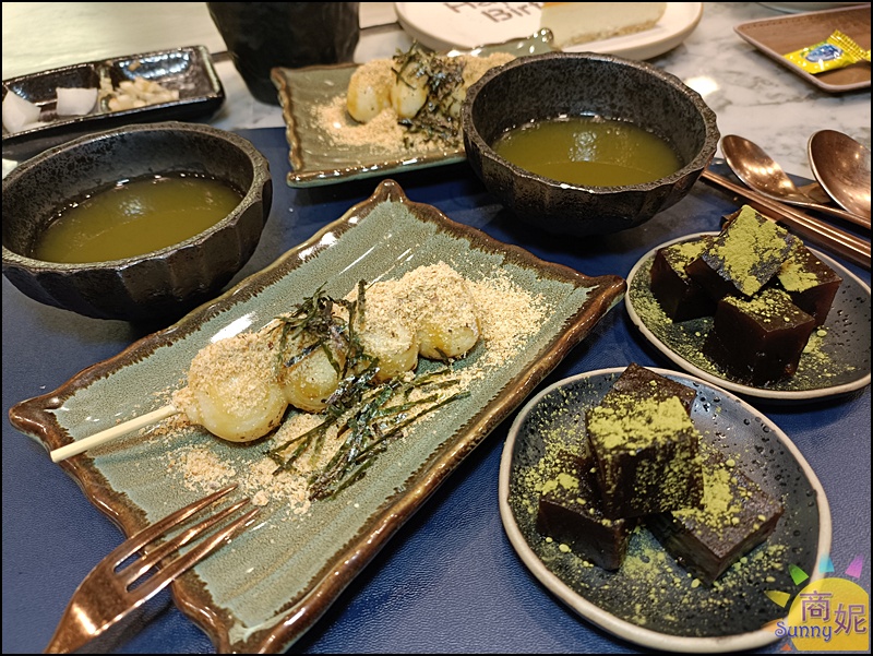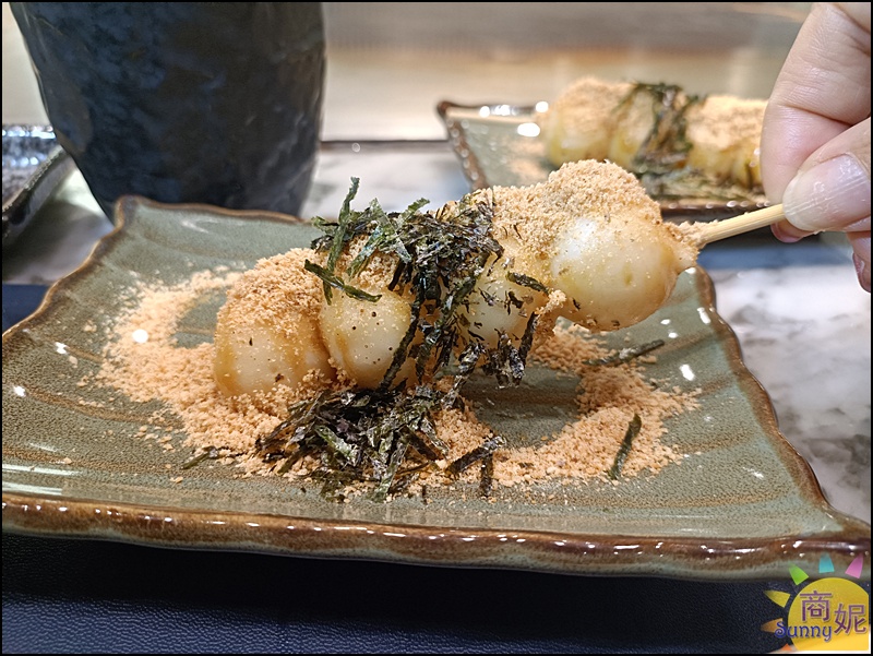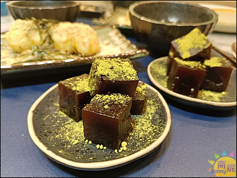 這次來用餐甜點我特別喜歡,日式糰子刷上特製照燒醬汁,在鐵板上一邊煎一邊用噴槍炙燒,最後撒上黃豆粉及海苔絲,口感QQ綿綿帶有鹹甜滋味,口味不會太重,搭配靜岡熱抹茶一起吃味道剛剛好。
