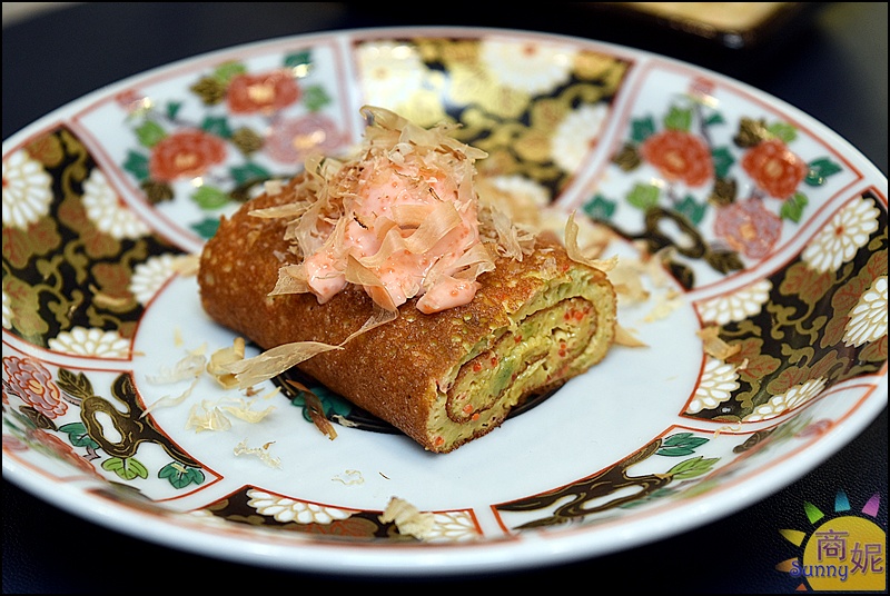 龍蝦膏芝心蛋捲味道非常濃郁,上頭還有明泰子醬及柴魚片。