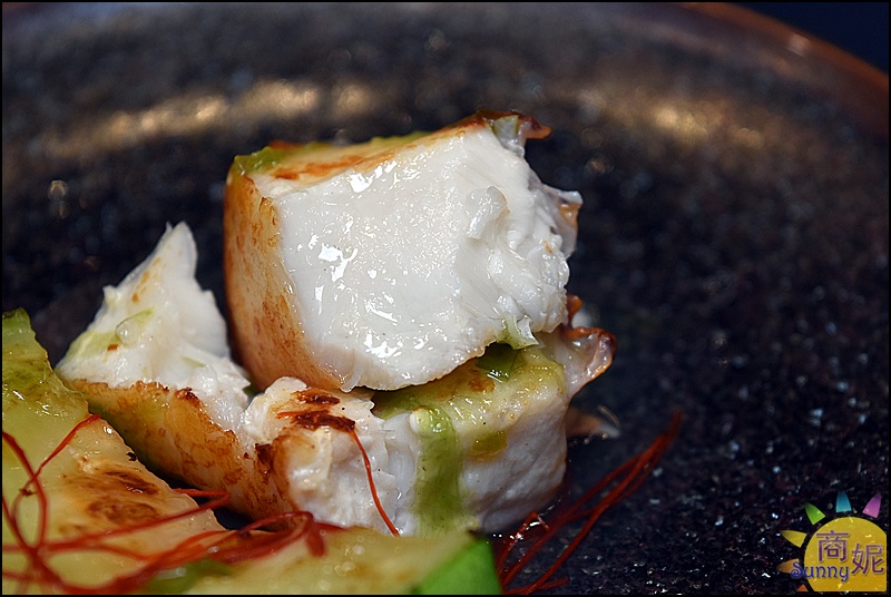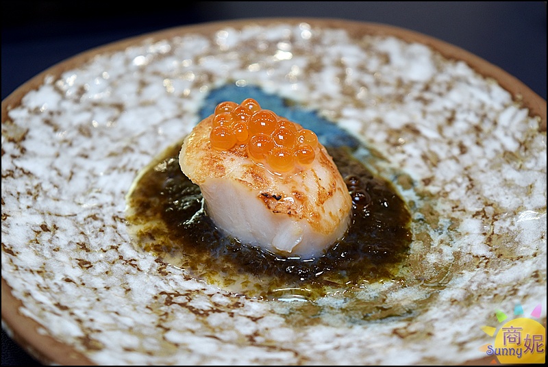 日本北海道生食級大干貝雙面煎到微焦,主廚控制在5~7分熟,吃的到軟嫩的口感與鮮甜的美味。