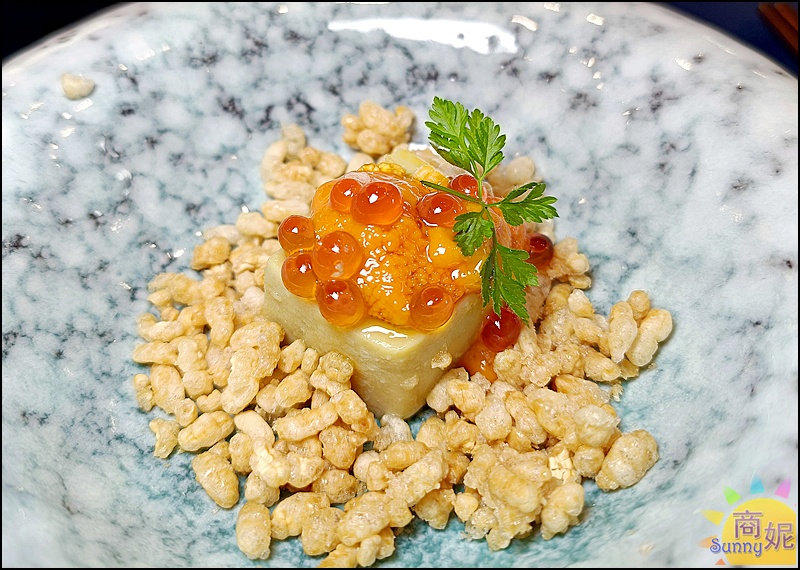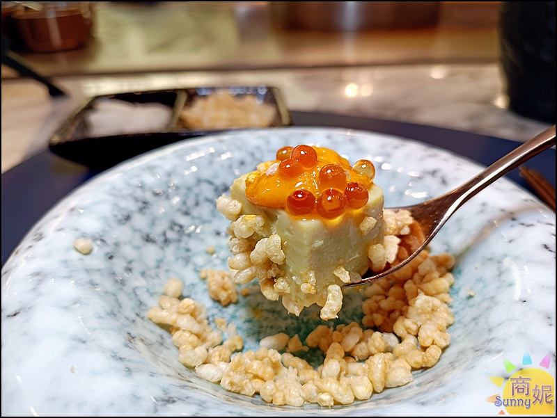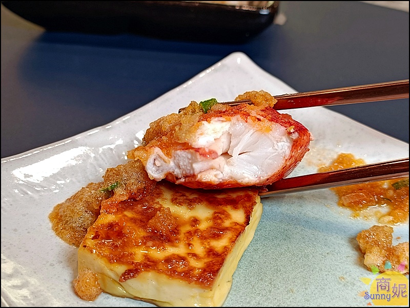 北海道赤海膽本身味道就鮮甜,底下還有蟹黃豆腐,上頭再搭配鮭魚卵,多重海味堆疊在一起很有層次感。