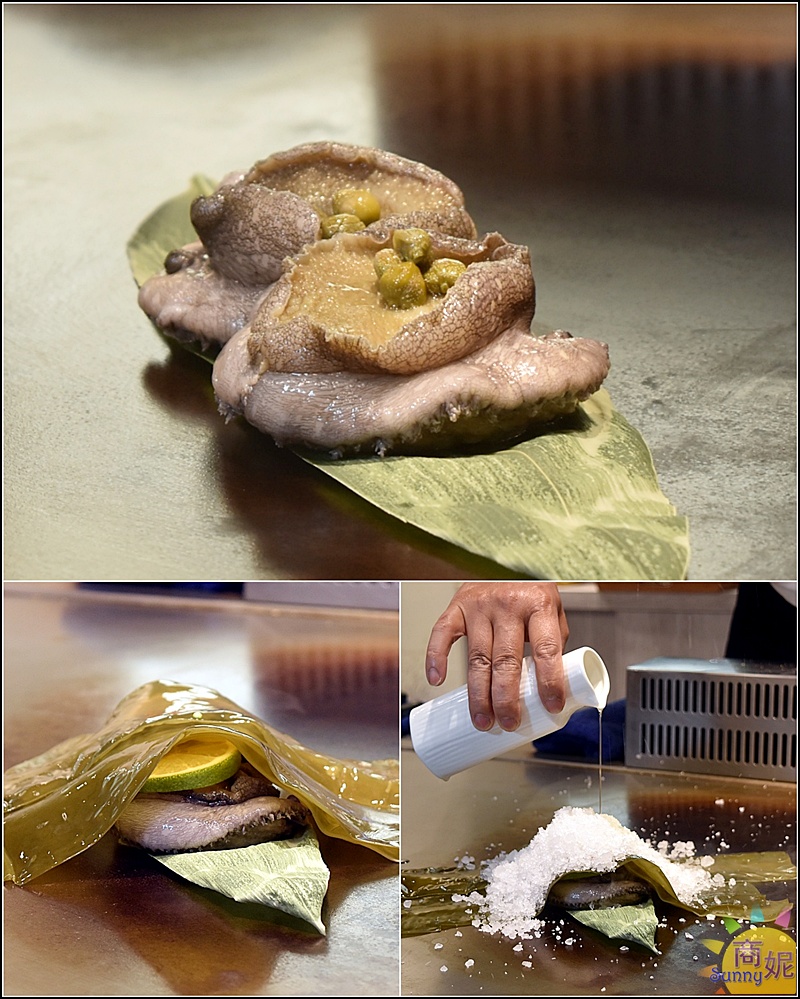 在鮑魚上放上酸豆、檸檬片增添香氣,再覆蓋昆布以及粗鹽慢慢蒸烤入味,這一道鹽蒸鮑魚的過程就是精彩料理秀充滿儀式感,整個色香味俱全~
