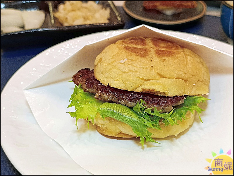 和牛漢堡排肉汁香甜,搭配赤味噌醬再加上鐵板煎烤過的菠蘿包一起吃,越咬越香。