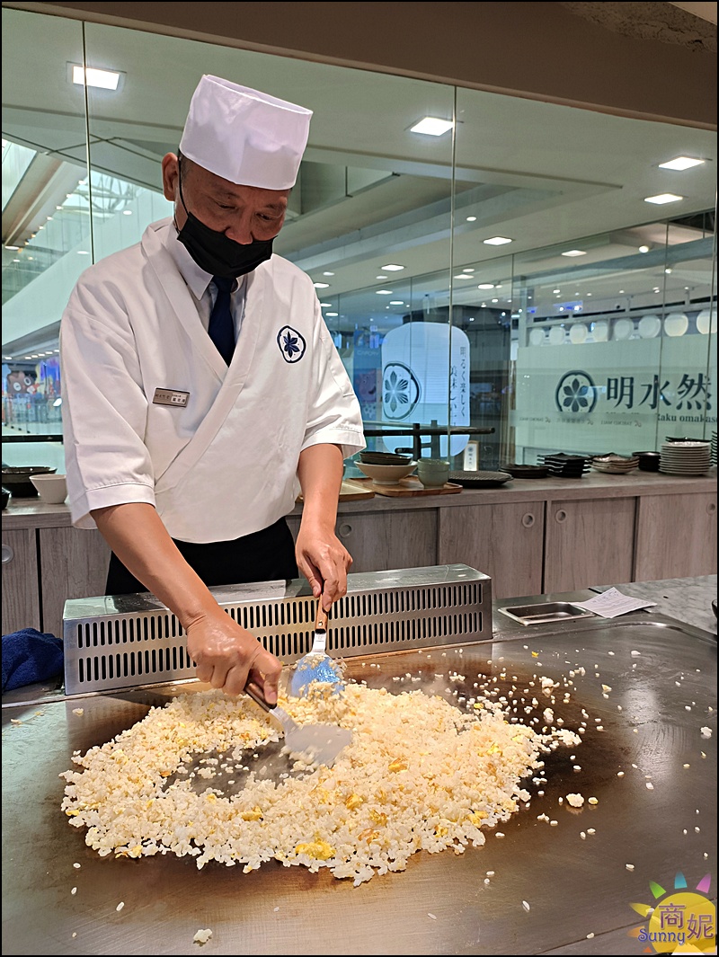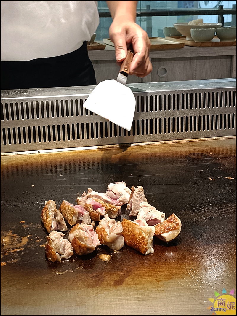 炒飯淋上蛋汁經過鐵板高溫爆炒,最後再加上蔥花與鱈魚卵,黃金炒飯粒粒分明還會在鐵板上跳舞,我們超愛看鐵板炒飯的料理秀。