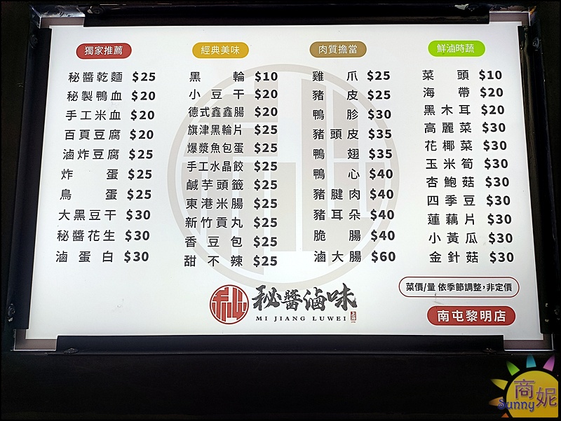 秘醬滷味菜單分四大類,算一算品項超過40種,價位非常親民10元就吃的到。