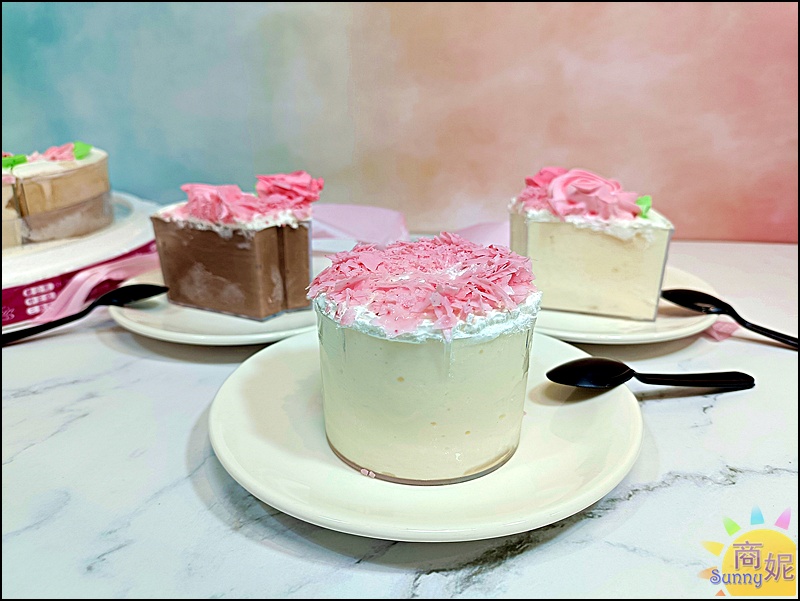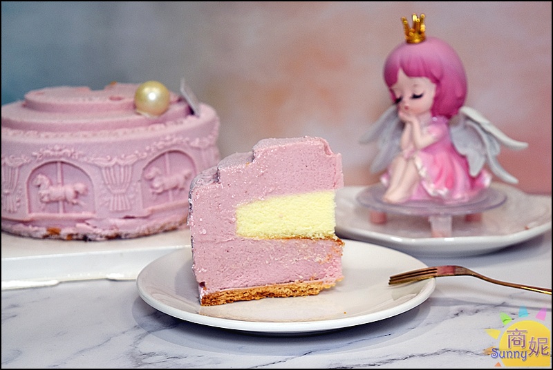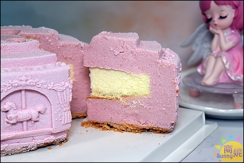 切開來看,滿滿的草莓慕斯中間包夾乳酪蛋糕,底下還有特製餅乾,粉嫩的色澤真的很討喜。