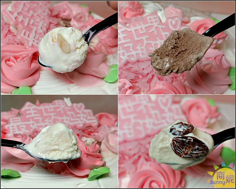 這款義式冰淇淋蛋糕很特別,底部一格一格分裝一共8格4種口味的分格冰淇淋,上面是草莓風味的絲滑奶油玫瑰花及碎巧克力片,造型漂亮極了。