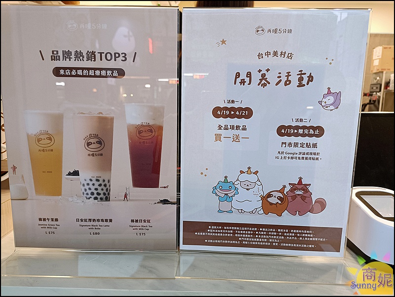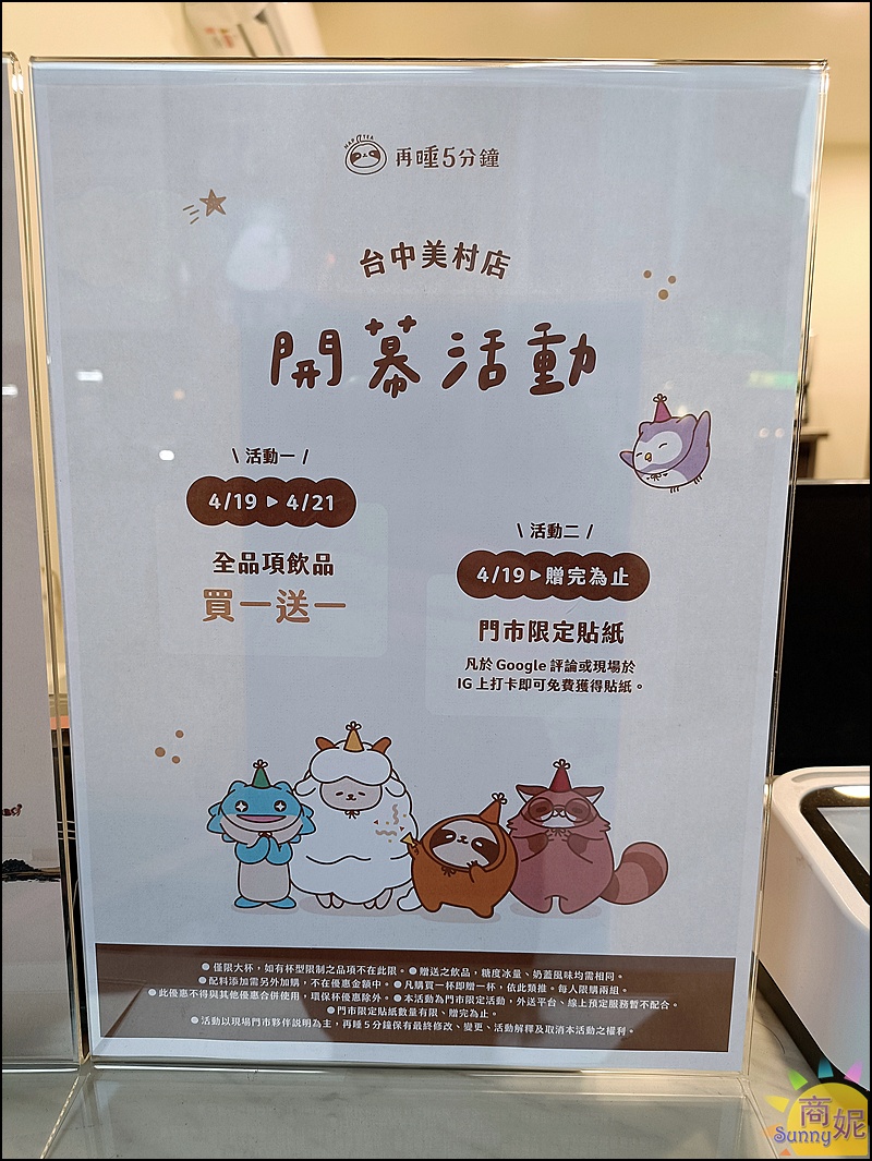 台中手搖飲又有一家生力軍~再睡5分鐘台中美村店新開幕連續三天買一送一!不是指定飲品而是全品項飲品買一送一真的很超值。再加碼Google評論或IG打卡就送門市限定貼紙,還有可愛療癒系的品牌週邊商品這裡也有販售。