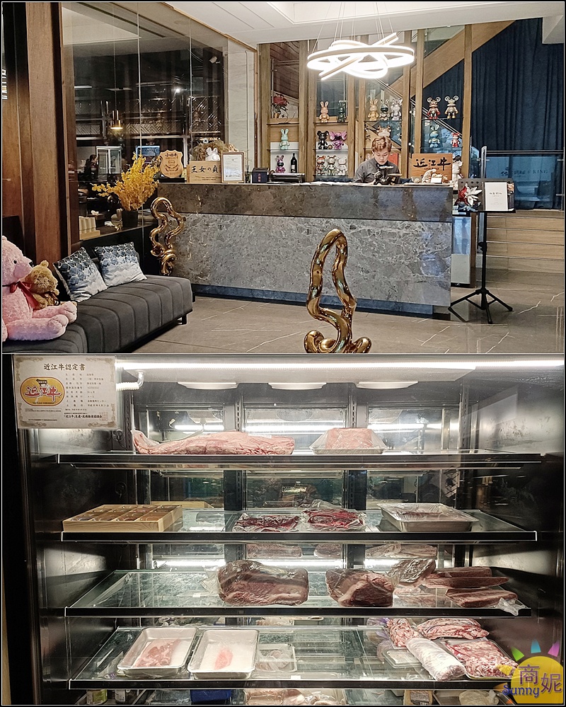 一進門迎賓區就很氣派,櫃檯上看到很多日本A5和牛產地木牌,近江牛、小田牛都是整隻進口再分切,二樓的展示櫃裡好多和牛部位,在佐賀野仁整頭牛都吃的到。