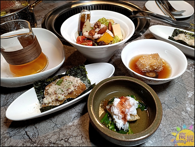 基本沾醬有特調的胡椒風味鹽、檸檬醋、燒肉沾醬,還有昆布鹽、椒麻醬,另外還有開胃小菜,自由搭配燒肉一起吃,有多種不同美味。