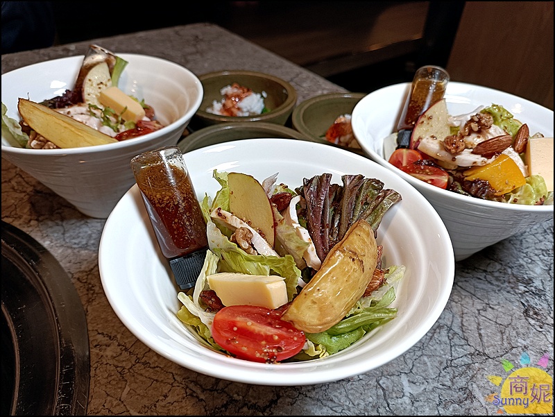 個人沙拉份量不少,各種生菜蘿蔓葉、堅果、新鮮水果、馬鈴薯、舒肥雞肉…,附一瓶和風油醋醬自己淋,整個相當清爽又開胃,大口吃肉之餘搭配生菜也很解膩。