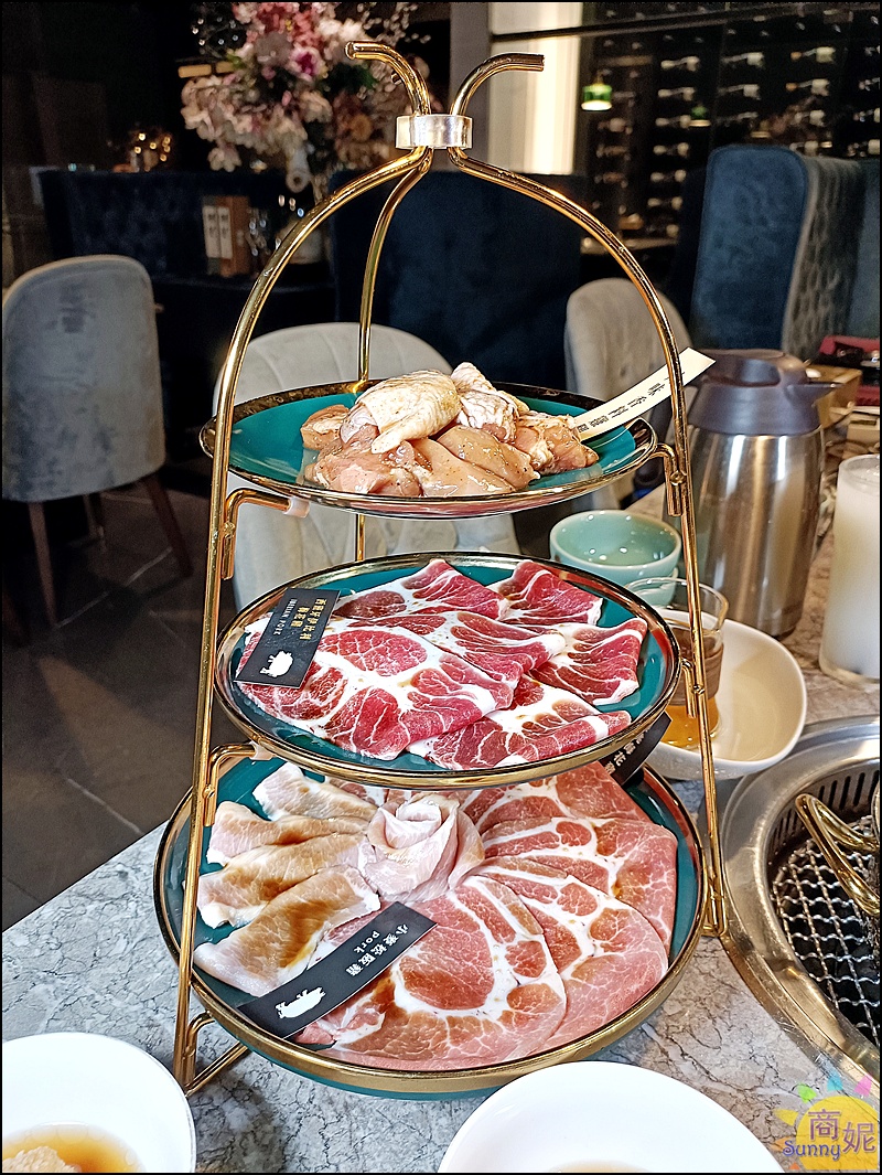 把三層架肉盤拿下來再拍一張,套餐的蔬菜跟海鮮還沒來就已經很豐盛了。