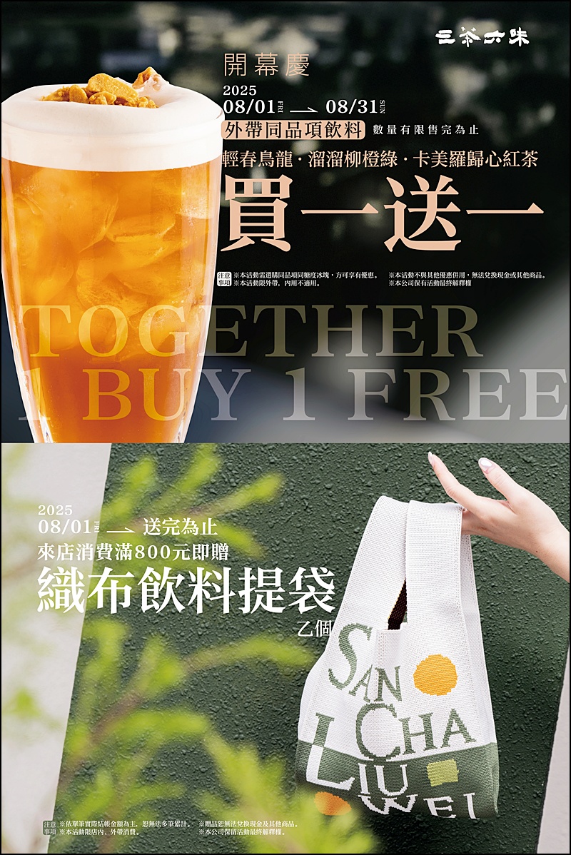注意事項: ※本活動需選購同品項同糖度冰塊,方可享有優惠。 ※本活動限外帶,內用不適用。 ※本活動不與其他優惠併用,無法兌換現金或其他商品。 - 08/01(五)起,到店消費滿800元即贈「織布飲料提袋」乙個,贈品送完為止。