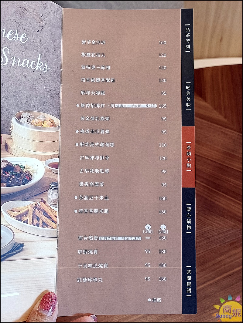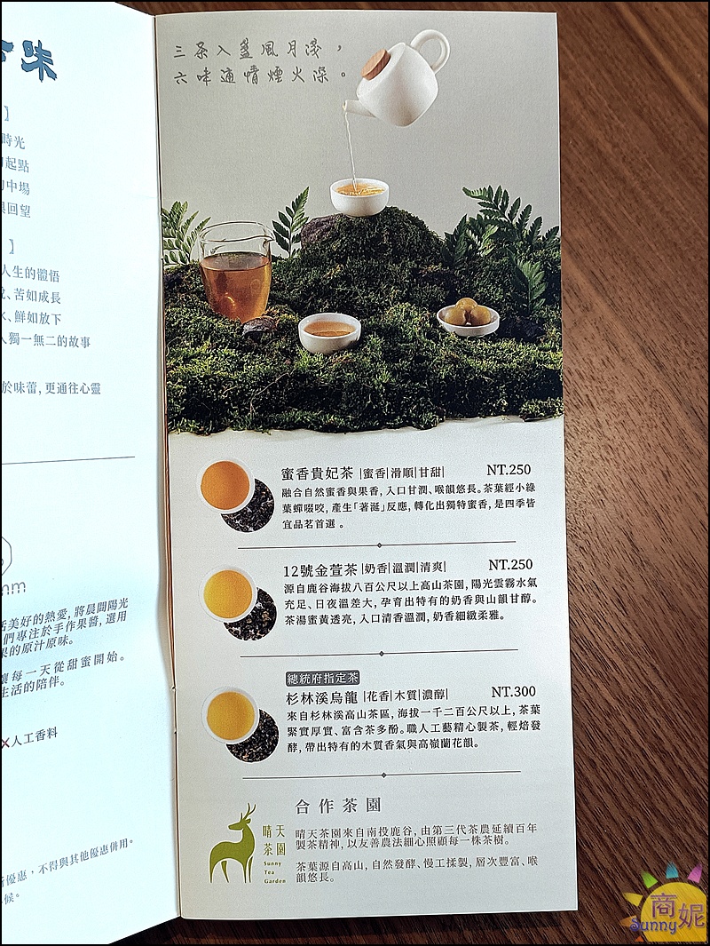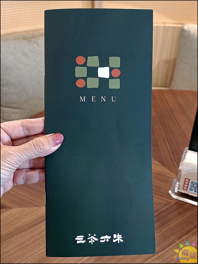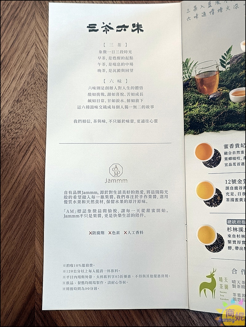 三茶六味菜單中選項多元,用餐加收10%服務費,每人低消一杯飲品,用餐時間90分鐘(無候位不限時)。